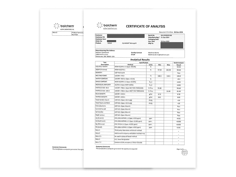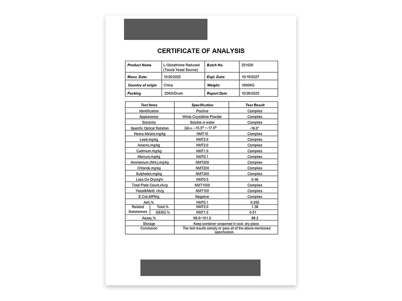 所有原料皆由國際大廠提供,並附有完整 COA(分析證明文件),確保成分、含量與安全性可追溯。
